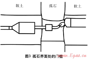 有人認(rèn)為增加洗孔次數(shù)可避免卡管,實(shí)際上在堅(jiān)硬孤石與松軟土壤交錯(cuò)分布的情況下,由于松軟土壤被反復(fù)沖刷,使得孔徑遠(yuǎn)大于堅(jiān)硬孤石上的孔徑,從而在兩者交界處形成門檻。洗孔次數(shù)越多,門檻越明顯,管道回拖時(shí)發(fā)生卡管的風(fēng)險(xiǎn)越大(圖3)。