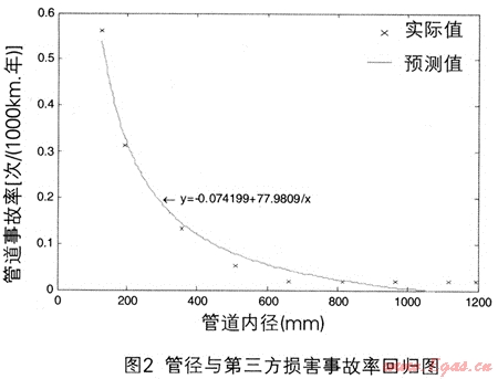根據(jù)表2數(shù)據(jù)以管徑為自變量(橫坐標(biāo)),事故率為因變量(縱坐標(biāo))繪制散點(diǎn)圖,觀察散點(diǎn)圖發(fā)現(xiàn)事故率與管徑存在遞減的函數(shù)關(guān)系,可以利用曲線線性回歸分析的辦法進(jìn)行試算,可供選擇和函數(shù)關(guān)系有:冪函數(shù)y=xa、指數(shù)函數(shù)y=ax、對數(shù)函數(shù)y=logax。經(jīng)過試算發(fā)現(xiàn)冪函數(shù)的擬合效果最好,確定為事故率回歸分析的函數(shù)類型。
