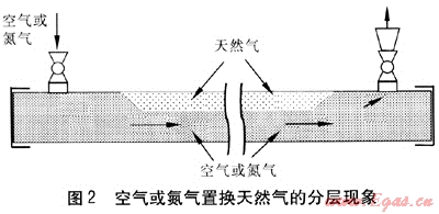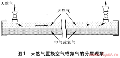 在置換過程中,將天然氣緩慢輸入到新建管道內(nèi),由于天然氣的密度小,相對(duì)密度一般為0.6左右,天然氣就會(huì)在管道的上部流動(dòng),而位于管道下部的空氣或氮?dú)饩蜁?huì)滯留在管道內(nèi)。當(dāng)檢測(cè)人員從出口取樣檢測(cè)時(shí),儀器會(huì)顯示體積分?jǐn)?shù)為100%的天然氣,如果此時(shí)停止置換,滯留在管道內(nèi)的空氣將與天然氣混合,非常可能形成爆炸性混合氣體,在用戶使用時(shí)發(fā)生危險(xiǎn)。這種情況會(huì)給安全運(yùn)行帶來極大的隱患。