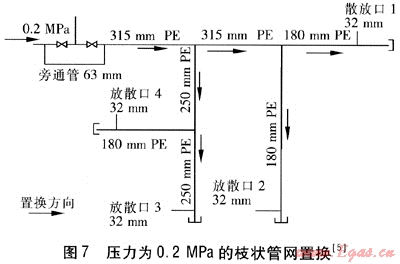 在城市燃?xì)夤艿捞烊粴馀c空氣置換過程中,多數(shù)管道都存在分支,除了管網(wǎng)末端很少有無支管的管道系統(tǒng)(見圖7[5])。必須針對(duì)管網(wǎng)系統(tǒng)選擇置換方法,以保證置換安全順利完成。一般情況下采用兩種方式:同時(shí)置換和順序置換,下文將介紹管網(wǎng)系統(tǒng)置換和用戶管道系統(tǒng)的置換。表3為管網(wǎng)壓力為0.2MPa的旁通管、放散管公稱管徑速查表[5]。