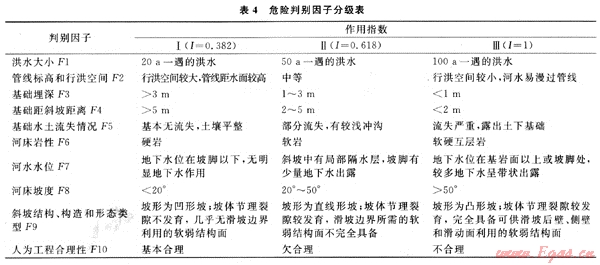 作用指數(shù)表示各因子在洪水危險(xiǎn)度判別中的作用大小,是一個相對比較的數(shù),是定性分析的定量表示。在分析某一自然現(xiàn)象的形成時,有主要原因(因子)、次要原因(因子)。利用黃金分割法,對主要、次要原因進(jìn)行數(shù)學(xué)分割,避免分配因子作用指數(shù)的隨意性。筆者對洪災(zāi)的判別因子采用“黃金分割”原理來確定因子三個等級的作用指數(shù)工,即危險(xiǎn)性大的作用指數(shù)I取為1,危險(xiǎn)性中等的作用指數(shù)I取0.618,危險(xiǎn)性小的作用指數(shù)I取0.382。危險(xiǎn)判別因子分級情況見表4。