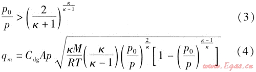 當(dāng)滿足式(3)時(shí),氣體流動(dòng)屬于亞聲速流動(dòng),燃?xì)庑孤┧俾视檬?4)計(jì)算[9]。