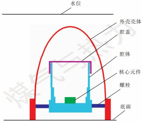 如圖2所示,防水透氣殼的外殼殼體采用橢球狀設(shè)計(jì),腔體高度大于外殼殼體高度的1/2。當(dāng)水位沒(méi)過(guò)裝置底面達(dá)10 m時(shí),防水透氣殼內(nèi)部氣體體積大約被壓縮到原體積的1/2,裝置的外殼殼體采用半橢球形設(shè)計(jì),因此,此時(shí)外殼殼體內(nèi)水面在外殼殼體高度的1/2位置以下。本裝置腔體的設(shè)計(jì)高度大于外殼殼體高度的1/2,因此,防水透氣殼內(nèi)的水面位置在腔蓋以下,可以防止液態(tài)水進(jìn)入腔體內(nèi)??梢?jiàn),即使在水位沒(méi)過(guò)裝置底面達(dá)10 m的惡劣條件下,該裝置仍能夠?qū)η惑w內(nèi)的核心元件起到很好的保護(hù)作用。