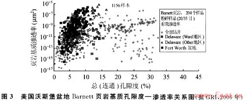 4) 頁巖氣藏儲層具典型的低孔低滲物性特征,頁巖產(chǎn)層厚度一般為15~100m,孔隙度一般為4%~6%,滲透率小于0.001×10-3μm2(見圖3)。處于斷裂帶或裂縫發(fā)育帶的頁巖儲層滲透率可以增加,孔隙度最高可達(dá)11%,滲透率可達(dá)1×10-3μm2左右[1]。據(jù)美國主要頁巖氣產(chǎn)層儲層物性統(tǒng)計,孔隙度為4.22%~6.51%,滲透率為40.9×10-6μm2。