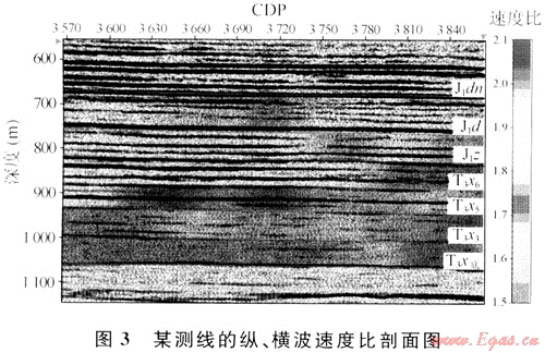 根據(jù)同一地層,縱波、橫波旅行時(shí)的差異,在層位匹配后可以得地層的平均縱、橫波速度比。由圖3可見,砂巖地層速度比大于泥巖速度比,清晰地分辨了砂泥層。