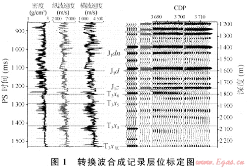 多波解釋首當(dāng)其沖的問題便是轉(zhuǎn)換波的地質(zhì)層位標(biāo)定。它是多分量解釋最為關(guān)鍵的一環(huán),也是國(guó)內(nèi)外公認(rèn)的一個(gè)難點(diǎn)。圖1是利用GeoMountain解釋工程師軟件在縱波地質(zhì)層位標(biāo)定的基礎(chǔ)上對(duì)GA2井進(jìn)行轉(zhuǎn)換波合成記錄地質(zhì)層位的標(biāo)定結(jié)果。