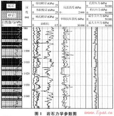 地層的孔隙壓力、體積模量、楊式模量、單軸抗壓強度、最小水平主應力方向等參數(shù)是出砂預測的重要參數(shù)。這些參數(shù)均可在實驗室和氣井生產(chǎn)過程得到,但得出的數(shù)據(jù)是離散的且成本較高。目前已經(jīng)有成熟的利用測井方法求散巖石力學參數(shù)的方法[1],筆者采用Schlumberger公司的STARS軟件,以縱波時差、橫波時差、補償密度、泥質(zhì)含量和地層孔隙度為輸入曲線,求取巖石的彈性模量和巖石強度。圖1為計算得到的地層的巖石力學參數(shù),這些參數(shù)將用于出砂預測。