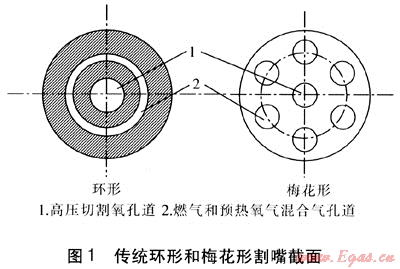 氧氣在切割中主要有兩個(gè)作用:①作預(yù)熱火焰的助燃?xì)怏w,這部分氧氣稱為預(yù)熱氧;②使金屬燃燒并將燃燒生成的熔渣排除,這部分氧氣稱為高壓切割氧。傳統(tǒng)切割用割炬的割嘴形式主要有環(huán)形和梅花形兩種[1]。環(huán)形割嘴主要由內(nèi)嘴和外嘴兩部分組合而成,又稱組合式割嘴。梅花形割嘴與環(huán)形不同,燃?xì)夂皖A(yù)熱氧的混合氣孔道呈小圓孔,均勻地分布在高壓切割氧孔道周圍,整個(gè)割嘴為一體,又稱整體式割嘴。傳統(tǒng)環(huán)形和梅花形割嘴截面見圖1。