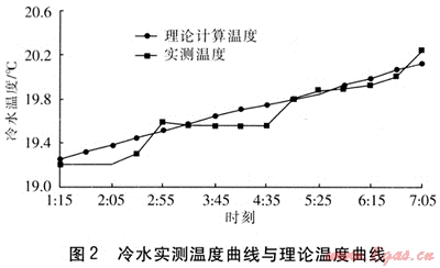 某日冷水機(jī)組關(guān)機(jī)后,不同時(shí)刻冷水實(shí)測(cè)溫度與由式(5)計(jì)算得到的理論溫度的比較見圖2。由圖2可知,實(shí)測(cè)溫度與由式(5)計(jì)算得到的理論溫度吻合較好,因此可采用式(5)計(jì)算停機(jī)后某時(shí)刻冷水溫度。