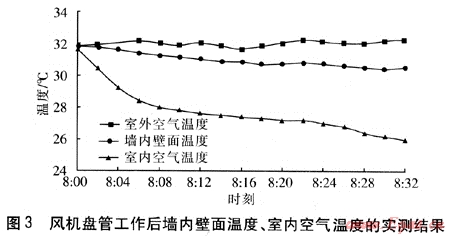2006年8月7日對(duì)風(fēng)機(jī)盤管工作后墻內(nèi)壁面溫度、室內(nèi)空氣溫度的實(shí)測(cè)結(jié)果見圖3。由圖3可知,墻內(nèi)壁面實(shí)測(cè)初始溫度為31.8℃,實(shí)測(cè)室內(nèi)初始空氣溫度為31.6℃。隨著風(fēng)機(jī)盤管的開啟,墻內(nèi)壁面溫度平緩下降,30min后降至30.5℃,由于時(shí)間較短,可以近似認(rèn)為墻內(nèi)壁面溫度保持不變。風(fēng)機(jī)盤管工作30min后,室內(nèi)空氣溫度由31.6℃降至26℃,風(fēng)機(jī)盤管工作時(shí)間與計(jì)算結(jié)果(18~23min)相差不大。