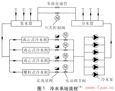 為了保證在部分負(fù)荷時(shí)冷水機(jī)組的高效運(yùn)行,選用3臺(tái)離心式冷水機(jī)與1臺(tái)螺桿式冷水機(jī),在過渡季節(jié)或負(fù)荷較小時(shí),只開啟螺桿式冷水機(jī)。冷水機(jī)進(jìn)出水溫度為13、7℃,冷水機(jī)與附屬設(shè)備見表1[8]??照{(diào)水系統(tǒng)為一次泵、末端變流量、機(jī)組側(cè)定流量系統(tǒng),采用二管制,豎向不分區(qū),末端空調(diào)裝置采用風(fēng)機(jī)盤管,冷水系統(tǒng)流程見圖1㈨。