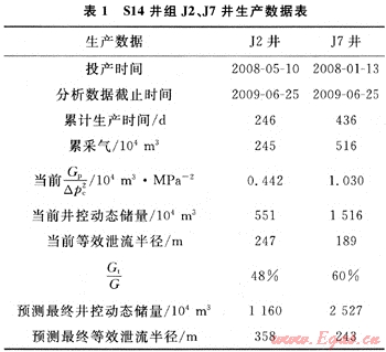 J2和J7是S14井組不同時(shí)間投產(chǎn)的生產(chǎn)井,基本數(shù)據(jù)如表1所示。首先根據(jù)氣井的生產(chǎn)時(shí)間及當(dāng)前單位套壓降產(chǎn)氣量查對(duì)Gp/△pc2-t圖版(圖2),可初步判斷蘇J2為Ⅲ類井,J7為Ⅱ類井;然后采用FAST.RTA軟件對(duì)氣井進(jìn)行動(dòng)態(tài)分析,可得到氣井的當(dāng)前井控動(dòng)態(tài)儲(chǔ)量Gt和等效泄流半徑(Rt);再根據(jù)井型和生產(chǎn)時(shí)間查對(duì)Gt/G-t圖版(圖3-b),得到2口井的Gt/G值分別為48%和60%,由此可求出最終井控動(dòng)態(tài)儲(chǔ)量(G)和最終等效泄流半徑(R)。