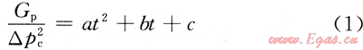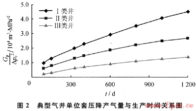 S6區(qū)塊是蘇里格氣田最早投產(chǎn)的區(qū)塊,其地質(zhì)條件與蘇里格氣田其他區(qū)塊相似,氣井的生產(chǎn)動(dòng)態(tài)也基本相似。S6區(qū)塊第一批生產(chǎn)井于2002年投產(chǎn),生產(chǎn)期已超過7a,氣井的滲流邊界已達(dá)到或接近真實(shí)的氣藏邊界,處于低壓低產(chǎn)中后期。在實(shí)際生產(chǎn)中,絕大部分氣井只進(jìn)行了井口油套壓和產(chǎn)量的監(jiān)測(cè),對(duì)氣井的生產(chǎn)數(shù)據(jù)進(jìn)行分析,發(fā)現(xiàn)氣井的單位套壓降采氣量(Gp/△pc2)隨生產(chǎn)時(shí)間動(dòng)態(tài)變化,兩者之間呈良好的二次多項(xiàng)式關(guān)系,相關(guān)系數(shù)大于0.96。即