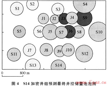 圖4是根據(jù)圖版預(yù)測(cè)得到的S14加密井組最終井控動(dòng)態(tài)儲(chǔ)量泡泡圖,可以看出它與生產(chǎn)早期的動(dòng)態(tài)分析結(jié)果(圖2)相比有很大差異。生產(chǎn)至廢棄時(shí),S14加密井組的平均最終井控動(dòng)態(tài)儲(chǔ)量為2920×104m3(最終可采出氣量為2480×104~2630×104m3),平均最終泄流面積為0.206km2,由于儲(chǔ)層具有較強(qiáng)的非均質(zhì)性。因此各單井的最終井控儲(chǔ)量和泄流面積之間存在較大的差異。