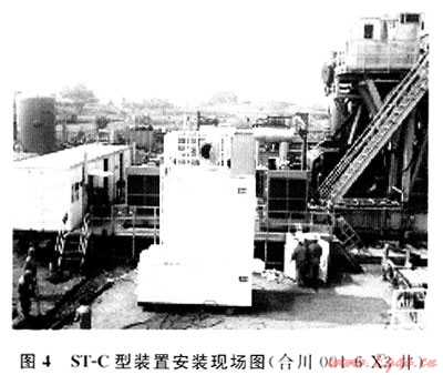 圖3是ST-A型裝置(單機(jī)配帶)在LG17井現(xiàn)場對(duì)比試驗(yàn)運(yùn)行實(shí)況,圖4是ST-C型裝置(三機(jī)配帶)在合川001-6-X3井現(xiàn)場安裝實(shí)況,均隨鉆井全周期同步運(yùn)行,取得了廢水源頭治理和廢氣消煙、降溫降噪的良好效果。