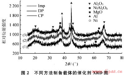 圖2為不同方法制備4%MgO-Al203載體制成催化劑的XRD譜圖。通過與標準譜圖進行對比可以得知這3種催化劑中都存在Ni、Al、MgO、Al203、NiAl2O4相,其中,當2θ為36°處存在NiAl2O4尖晶石的衍射峰,共沉淀法制備的載體催化劑的NiAl2O4衍射峰最弱,而其他兩種方法NiAl2O4的衍射峰逐漸增強,說明Ni與Al2O3的相互作用較強,使活性中心Ni的含量較少,進而影響其催化劑的催化活性。