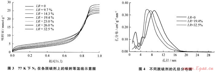 由表1看出,新脫硫劑的比表面積、孔容和孔徑都隨吸收劑涂漬比的增加而減小,同時(shí)由圖4可以看出,隨吸收劑涂漬比增加微孔大量減少,LR為32.5%的脫硫劑,微孔已經(jīng)基本消失。