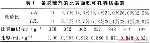 以上結(jié)果說明,涂漬液除在脫硫劑的中孔表面形成液膜,引起中孔孔徑減少外,還會(huì)堵塞微孔。