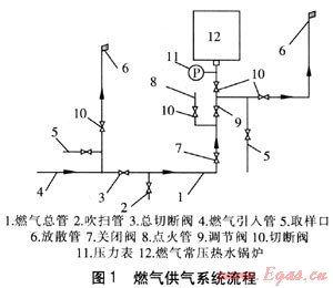 燃?xì)夤庀到y(tǒng)流程見(jiàn)圖1。燃?xì)夤艿涝谕V惯\(yùn)行進(jìn)行檢修時(shí),為檢修工作安全,需要管道內(nèi)的燃?xì)獯祾吒蓛?。系統(tǒng)在較長(zhǎng)時(shí)間停止工作后再投入運(yùn)行前,也需要進(jìn)行吹掃。因此,在鍋爐房供氣系統(tǒng)設(shè)計(jì)中,應(yīng)設(shè)置吹掃和放散管道。放散管出口應(yīng)高出屋脊2m以上。由鍋爐房外部引入的燃?xì)饪偣?,在進(jìn)口處應(yīng)裝設(shè)燃?xì)饪偳袛嚅y,按燃?xì)饬鲃?dòng)的方向,閥前應(yīng)裝放散管,并在放散管上裝設(shè)取樣口,閥后應(yīng)裝吹掃管。為保證鍋爐安全可靠運(yùn)行,要求供氣管和其他管道上安裝的附件連接嚴(yán)密可靠,能承受最高使用壓力,且不得裝設(shè)在高溫和有危險(xiǎn)的地方[3、4]。