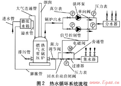 熱水循環(huán)系統(tǒng)流程見(jiàn)圖2。循環(huán)泵設(shè)在鍋爐的出水側(cè),即燃?xì)獬簾崴仩t出水管與循環(huán)泵入口連接。循環(huán)泵的揚(yáng)程為管道水頭損失加上鍋爐與供熱系統(tǒng)最高點(diǎn)之間的重力水頭及附加水頭余量之和。