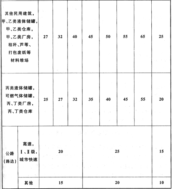 注:居住區(qū)、村鎮(zhèn)指1000人或300戶及以上者;當少于1000人或300戶時,相應(yīng)防火間距應(yīng)按本表有關(guān)其他民用建筑的要求確定。