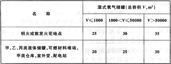 表4.3.3 濕式氧氣儲罐與建筑物、儲罐、堆場等的防火間距(m)