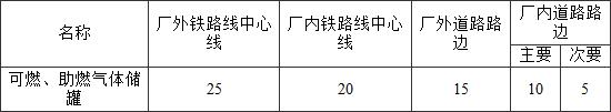 表4.3.6 可燃、助燃氣體儲罐與鐵路、道路的防火間距(m)