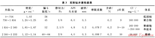 直井段采用低固相聚合物體系,膏鹽層段采用聚磺欠飽和一飽和鹽水體系,第3次開鉆井段采用聚磺體系。由于鹽層中高壓鹽水的存在,其存在又無(wú)規(guī)律,鹽水浸入又易導(dǎo)致鹽析發(fā)生卡鉆事故,現(xiàn)場(chǎng)試驗(yàn)地層破裂壓力系數(shù)在1.9g/cm3以上。因此,該井膏鹽層使用了比直井更高的鉆井液密度,目的是防止斜井段高壓鹽水浸和鹽層蠕動(dòng)變形。在膏鹽層段主要要提高鉆井液的潤(rùn)滑性,防止阻卡及降低鉆井液的流動(dòng)阻力,提高鉆井液的抗污染能力。有效避免鹽膏層的溶解、污染、縮徑、大井徑、井塌等一系列井下復(fù)雜和事故的發(fā)生,實(shí)際鉆井液性能,見表3。