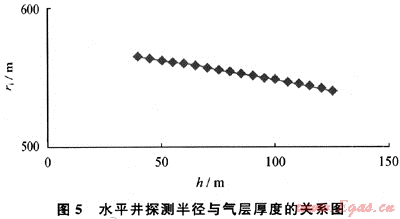 給定氣層厚度40~125m,其他參數(shù)同前,由式(8)得出探測半徑與氣層厚度的關(guān)系(圖5)??梢钥闯觯簹鈱雍穸仍龃螅綔y半徑減小,但減小的幅度很小。此即說明滲流截面積越大,壓力波向地層推進越慢。