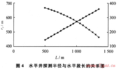 給定水平井段長500~1350m,測試時間10h,其他參數(shù)同前,由式(8)得出探測半徑與水平段長度的關(guān)系(圖4)??梢钥闯觯簲M圓形坑道外緣半徑隨水平段長的增產(chǎn)而變大,而探測半徑是降低的。