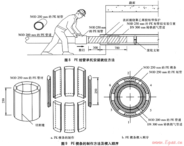 ② 如圖8所示,在NOD 200mm的PE管道上套入一截長(zhǎng)度為300mm的NOD 250mm的PE短管(PE80、SDR11),并將其置于套管內(nèi);由于NOD 250mm的PE短管的內(nèi)徑比NOD 200mm的PE燃?xì)夤艿赖耐鈴铰源螅m合用作對(duì)NOD 200mm的PE燃?xì)夤艿肋M(jìn)行限位、支承的承托。NOD 250mm的PE短管外側(cè)與套管端口的水平凈距為200mm,作為柔性防水層封堵的預(yù)留空間。