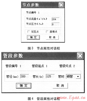 定義以管道為中心線且平行于管道的小面積矩形為線捕捉區(qū)域,以節(jié)點(diǎn)為圓心的小面積圓形為點(diǎn)捕捉區(qū)域,鼠標(biāo)在上述區(qū)域內(nèi)雙擊會(huì)分別彈出節(jié)點(diǎn)屬性和管段屬性對(duì)話框帕J,見圖3、4,為相應(yīng)的節(jié)點(diǎn)輸入流量或壓力,為相應(yīng)的管段輸入管長、管徑、管材。對(duì)于多氣源管網(wǎng)還需輸入氣源屬性,程序通過節(jié)點(diǎn)編號(hào)重排使得壓力基準(zhǔn)點(diǎn)編號(hào)最大,定壓點(diǎn)隨基準(zhǔn)點(diǎn)居后編排,便于節(jié)點(diǎn)方程組的求解。點(diǎn)捕捉和線捕捉技術(shù)實(shí)現(xiàn)了管網(wǎng)圖和數(shù)據(jù)的緊密結(jié)合,更加直觀、形象,輸入大量管段和節(jié)點(diǎn)參數(shù)時(shí),很大程度上減少了輸入的差錯(cuò),提高了效率。