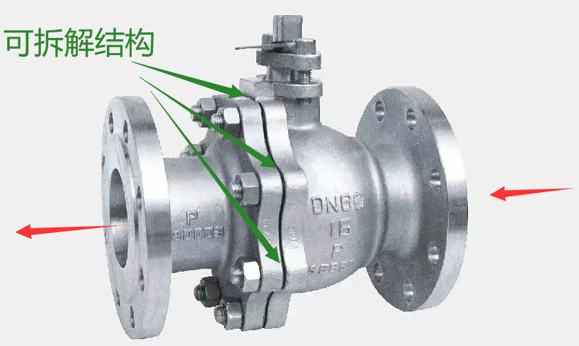 如果上述的球閥安裝方向分正反的話,那這種常見的球閥我想是不是也該按紅色箭頭安裝方向進(jìn)行安裝。因?yàn)橛覀?cè)也是一個(gè)可拆解的結(jié)構(gòu)(猜測(cè)很難拆解,但維修過(guò)閥門的都知道,另外閥門本體此處泄漏的可能性有多少?)。