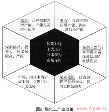 根據(jù)煤化工終端產(chǎn)品的不同,其重要性及配套政策也各不相同的。比如焦炭、電石及甲醇,因?yàn)樗鼈兌贾皇浅跫?jí)的煤化工產(chǎn)品,技術(shù)要求不高,產(chǎn)能已經(jīng)嚴(yán)重過(guò)剩,因此,合理控制新增產(chǎn)能,淘汰落后工藝就顯得尤為重要;而對(duì)于煤制氣,國(guó)家就采用了鼓勵(lì)政策,要求在資源豐富、煤價(jià)低的地區(qū)鼓勵(lì)發(fā)展;對(duì)于煤制油,因?yàn)槠渫顿Y需求巨大,技術(shù)風(fēng)險(xiǎn)相對(duì)較高,國(guó)家采取了嚴(yán)格監(jiān)管摸索前進(jìn)的方針(圖2)。