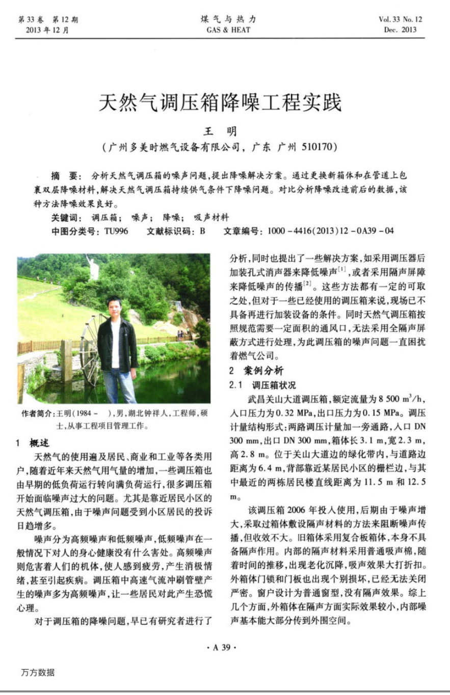 摘要:分析天然氣調(diào)壓箱的噪聲問題,提出降噪解決方案。通過更換新箱體和在管道上包裹雙層降噪材料,解決天然氣調(diào)壓箱持續(xù)供氣條件下降噪問題。對(duì)比分析降噪改造前后的數(shù)據(jù),該種方法降噪效果良好。