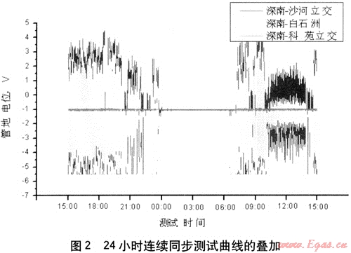表1為深南-科苑立交、沙河立交、白石洲管地電位24小時(shí)連續(xù)同步測(cè)試數(shù)據(jù),圖2為上述測(cè)試點(diǎn)的24小時(shí)連續(xù)同步測(cè)試曲線的疊加。