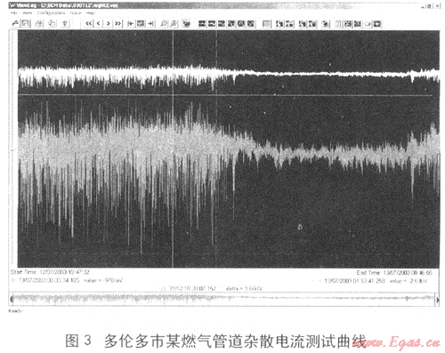 美國(guó)腐蝕工程師學(xué)會(huì)(NACE)在2004年發(fā)布了一篇報(bào)告《對(duì)影響管道的雜散電流的一種測(cè)試技術(shù)》,報(bào)告中提出可以采用SCM測(cè)試儀等方法對(duì)影響管道的雜散電流進(jìn)行測(cè)試,并以加拿大多倫多市的一條燃?xì)夤芫€的測(cè)試數(shù)據(jù)為例進(jìn)行分析,詳見圖3。測(cè)試數(shù)據(jù)顯示,燃?xì)夤艿朗艿诫s散電流干擾,報(bào)告中分析干擾信號(hào)與附近電氣化鐵路的運(yùn)行有關(guān),應(yīng)該是來(lái)源于鐵路的運(yùn)行。