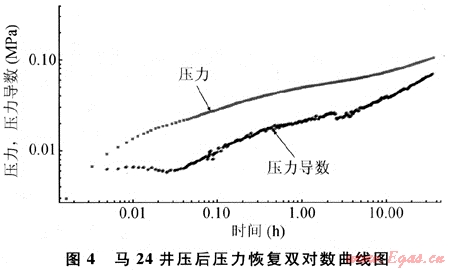 在馬24井為代表的壓后壓力雙對數曲線上,壓力與壓力導數成鐵軌狀,水力裂縫特征明顯,說明壓后在地層中形成了主裂縫(圖4)。