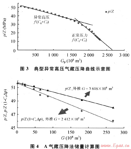 對異常高壓氣藏,由于儲層的欠壓實作用,使得巖石有效壓縮系數(shù)(Cf)比常壓氣藏高一個數(shù)量級,在4×10-6×10-3MPa-1,而表征氣體彈性膨脹能力的壓縮系數(shù)Cg值遠低于常壓情況,其數(shù)量級也在10-3MPa-1,也就是說在高壓階段Cg值與Cf值數(shù)量級相當,因此在高壓階段不能忽略巖石孔隙壓縮所提供的彈性膨脹能量,這一特點使得高壓氣藏的壓降曲線出現(xiàn)兩段式(見圖3),直接用高壓階段的壓降曲線計算動態(tài)儲量會導致結果偏高。針對這一情況,異常高壓氣藏物質平衡法考慮到了巖石有效壓縮系數(shù)Cf影響,對壓降曲線進行了修正。圖4就是A氣藏壓降曲線圖,根據(jù)壓降曲線回歸,傳統(tǒng)的p/Z-Gp曲線計算動態(tài)儲量為3616×108m3,是容積法儲量的1.3倍,考慮到巖石有效壓縮系數(shù)的情況下,經(jīng)過修正后的壓降曲線計算動態(tài)儲量為2412×108m3,與容積法儲量基本符合。由此可見對異常高壓氣藏,巖石彈性膨脹為氣體的采出提供了不可忽視的能量。