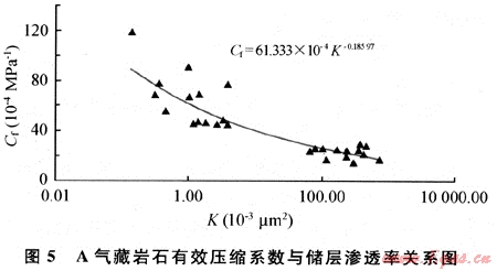 實驗分析表明,對于同一個氣藏,Cf值與其他物性參數(shù)一樣,也同樣具有非均質性。圖5為A氣藏巖心分析結果,從中可以看出,Cf與儲層滲透率有關,高滲儲層Cf值低,低滲儲層Cf值高,對于該氣田不同滲透率巖樣,Cf的變化范圍為2×10-3~10×10-3MPa-1。針對不同的Cf值,動態(tài)儲量計算結果也不同,Cf值越大,動態(tài)儲量計算結果越?。籆f值越小,動態(tài)儲量計算結果越大。