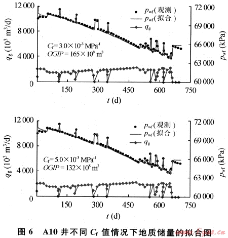 在數(shù)值模擬中,巖石壓縮系數(shù)作為已知參數(shù)輸入到模型中,其取值會給歷史擬合過程中儲量的擬合帶來影響,在其他參數(shù)相向、流壓和關井壓力完全擬合的情況下,不同的Cf值對應不同擬合儲量(見圖6),從另一個角度來看,對于一個未投入開發(fā)異常高壓氣藏,以容積法儲量為基礎進行生產(chǎn)動態(tài)預測時,不同的Cf值會得到不同的早期壓力變化趨勢。由此可見,對于異常高壓氣藏,獲得可靠的巖石壓縮系數(shù)值對早期動態(tài)儲量計算和生產(chǎn)特征認識非常重要。