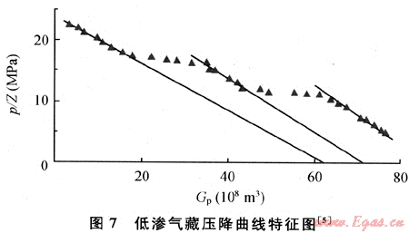 對于非均質性比較強的低滲氣藏,儲層中的流動存在著啟動壓力。在開采初期,參與流動的主要是滲透率相對較高的或縫洞比較發(fā)育的儲層中的氣體,隨著天然氣的采出,儲層中的壓降漏斗進一步增大,低滲儲層中的天然氣也開始參與流動。這類氣藏的壓降曲線(p/Z-Gp曲線)具有多段特征[7~8](見圖7)。如果利用早期的壓降曲線,會導致動態(tài)儲量計算結果偏低。