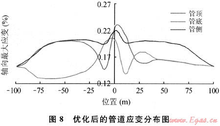 由2.2.1.2分析可知,該埋地管道的溝寬取1.9m比較經(jīng)濟(jì)。此時(shí)埋地管道的埋深取1.8m,管溝坡度取1:1,管溝內(nèi)采用彈性模量為1×105Pa的土壤回填。在上述條件下重新計(jì)算管道的應(yīng)變(見(jiàn)圖8),和圖5比較可知,管道最大拉伸應(yīng)變由0.33%降低到0.24%,降低了27.27%。