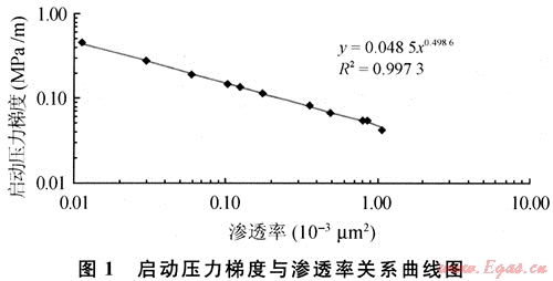 經(jīng)對11塊全直徑巖樣的室內(nèi)實驗表明,儲層滲透率對啟動壓力梯度[3]有明顯的影響,隨著巖石空氣滲透率的降低,啟動壓力梯度增大(圖1)。