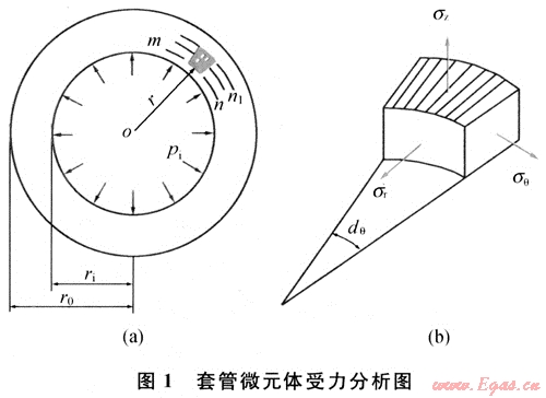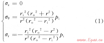套管在井下情況的受力較為復(fù)雜,為了分析方便,主要考慮套管受內(nèi)壓和外擠作用(即管內(nèi)外壓差),而忽略軸向力和溫度對(duì)管柱應(yīng)力的影響時(shí),套管屬于中厚壁管(圖1)。