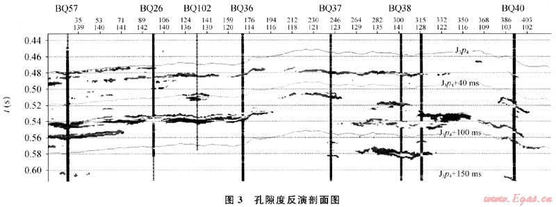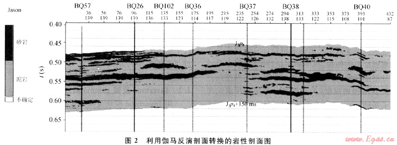 由于統(tǒng)計了多井點樣本數(shù)據(jù)的地質(zhì)、地震特性,在儲層屬性建模中進(jìn)行約束,這優(yōu)化了對儲層的模擬。從利用該模塊反演的過井Gamma剖面看,其整體面貌好,但個別井始終對應(yīng)不好(如BQ36井)。