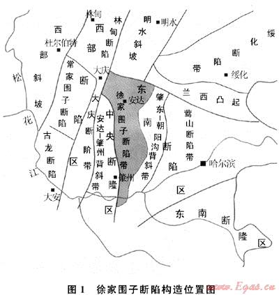 徐家圍子斷陷位于松遼盆地古中央隆起帶東部,面積約5350km2,斷陷在晚侏羅世-早白堊世早期形成。斷陷西部為斷階帶,中部為深洼帶,東部為斜坡帶。西側(cè)與古中央隆起帶結(jié)合部為一大型的基底斷裂面,該斷裂面高差為3000~5000m,寬6~13km。斷陷向東逐步抬升進(jìn)入肇東-朝陽(yáng)溝隆起帶(圖1)。