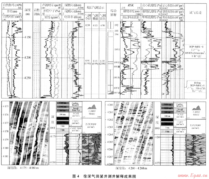 利用上述方法編制常規(guī)測(cè)井資料識(shí)別裂縫發(fā)育程度評(píng)價(jià)程序和裂縫參數(shù)計(jì)算程序,并對(duì)研究區(qū)若干井進(jìn)行了計(jì)算,圖4是其中一口井的處理解釋結(jié)果:195Ⅰ層TCP+MFE-Ⅰ測(cè)試,日產(chǎn)氣105876m3,該層地層因數(shù)比值為15.6,裂縫角度指示參數(shù)為1.9,顯示該層高角度裂縫較發(fā)育,裂縫張開度1150.5μm,裂縫孔隙度0.11%,裂縫滲透率310.9×10-3μm2,F(xiàn)MI圖像顯示195Ⅰ層垂直縫和高角度縫發(fā)育,核磁測(cè)井T2分布譜顯示為30ms以上的大孔隙,表明本層裂縫提供了極好的流體滲流通道,使得儲(chǔ)層在自然測(cè)試時(shí)能達(dá)到高產(chǎn)。下部195Ⅴ、195Ⅵ兩層地層因數(shù)比值29.9,裂縫角度指示參數(shù)0.5,顯示該段地層發(fā)育40°~70°的傾斜裂縫,測(cè)井計(jì)算的裂縫張開度為9.8μm,裂縫孔隙度0.02%,裂縫滲透率0.002×10-3μm2,表明該段地層裂縫雖然發(fā)育,但為無(wú)效縫或裂縫的徑向延伸較淺,沒有起到溝通流體滲流通道的作用,對(duì)產(chǎn)能沒有貢獻(xiàn)。FMI圖像顯示195Ⅴ、195Ⅵ兩層存在誘導(dǎo)縫特征,徑向延伸短,裂縫開度小,是無(wú)效縫。核磁測(cè)井T2分布譜顯示小于30ms的束縛水孔隙,地層裂縫被低阻泥質(zhì)充填。該段地層經(jīng)TCP+MFE-Ⅰ測(cè)試,日產(chǎn)氣106m3。
