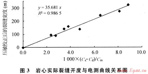 巖心實(shí)際裂縫開度(經(jīng)壓敏校正)與電測(cè)值關(guān)系(圖3)表明:A=3.5×104,比理論值高,說(shuō)明工區(qū)低角度縫很少。當(dāng)出現(xiàn)低角度縫且Cs<Cd時(shí),公式中的(Cs-Cd)換成(Cd-Cb),其中,Cb為基巖塊電導(dǎo)率,從與解釋層鄰近的非裂縫性地層讀取,裂縫愈發(fā)育,側(cè)向測(cè)井比基質(zhì)電阻率降得愈低。