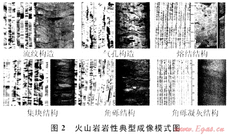 徐深氣田火山巖巖性成因復(fù)雜,即使巖石化學(xué)成分相同,但如果結(jié)構(gòu)、構(gòu)造不同,其巖石類型也會不同。而應(yīng)用交會圖版法雖然可以識別成分不同的巖性(如酸性巖、中性巖和基性巖等),但對于成分相同、而結(jié)構(gòu)或構(gòu)造不同的巖性如流紋質(zhì)熔結(jié)凝灰?guī)r、角礫凝灰?guī)r、火山集塊巖、火山角礫巖這些火山巖巖性識別效果較差,對這類巖性必須結(jié)合成像測井進行識別。圖2為火山巖典型成像模式圖。
